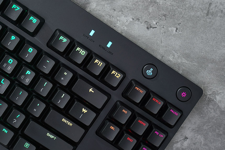 로지텍 G PRO X 게이밍 키보드의 오른쪽 위에는 게임 모드를 변경할 수 있는 버튼과 라이트를 켜고 끌 수 있는 키가 별도로 배치되어 있습니다. 그리고 FN키를 조합해서 미디어 파일을 재생하거나 볼륨을 조절할 수 있는 기능도 지원합니다.