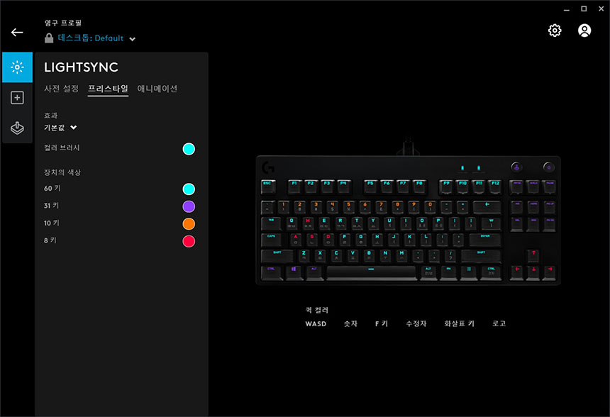 프리스타일에서는 로지텍 G PRO X 게이밍 키보드의 개별 키의 LIGHTSYNC RGB 조명을 자신이 플레이하는 게임이나 자주 사용하는 프로그램에 맞게 변경할 수 있습니다.