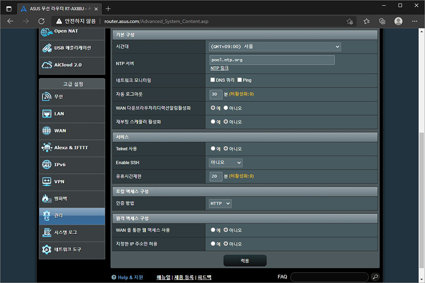 관리 메뉴의 시스템 항목을 확인해 보면 라우터 로그인 이름과 비밀번호를 변경할 수 있는 기능들이 준비되어 있습니다. 내부 네트워크의 보안을 위해서는 가능하면 복잡하게 설정하는 것을 추천합니다.