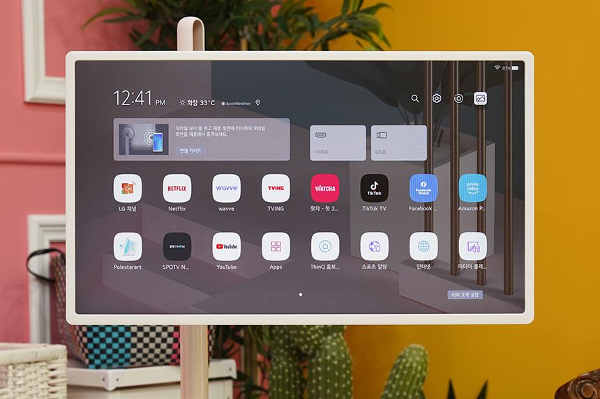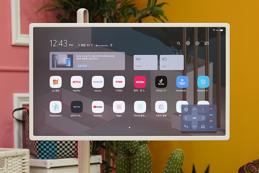 LG 스탠바이미(27ART10)에는 2021년형 LG TV와 같은 webOS 6.0이 탑재되었습니다. 그래서 스마트폰과 연결하지 않고도 LG 채널이나 넷플릭스 그리고 웨이브와 왓챠 등 다양한 서비스를 독립적으로 사용할 수 있습니다.