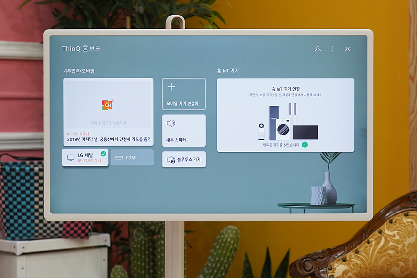 LG 스탠바이미(27ART10)에는 다른 LG전자의 최신 TV와 같이 ThinQ 홈보드 기능이 탑재되었습니다. LG전자의 제품은 물론이고 서드파티의 IoT기기들도 한 번에 관리할 수 있도록 도와주는 기능이라고 할 수 있습니다. 저와 같이 관련 제품들을 많이 사용하는 분들에게는 은근히 유용합니다.