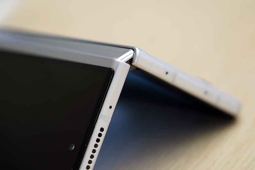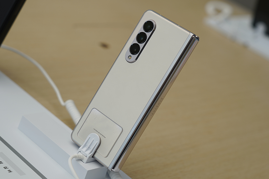 삼성 갤럭시Z 폴드3는 이전 세대의 제품과 같이 힌지 부분에 약간의 틈이 있도록 제작되었습니다. 메인 스크린이 완전히 180도 접혀서 파손되는 것을 방지하기 위한 대책 중의 하나입니다. 그리고 아머 알루미늄 프레임이 적용되어서 강력한 내구성을 제공합니다.
