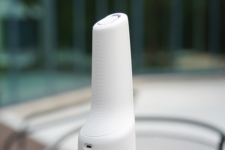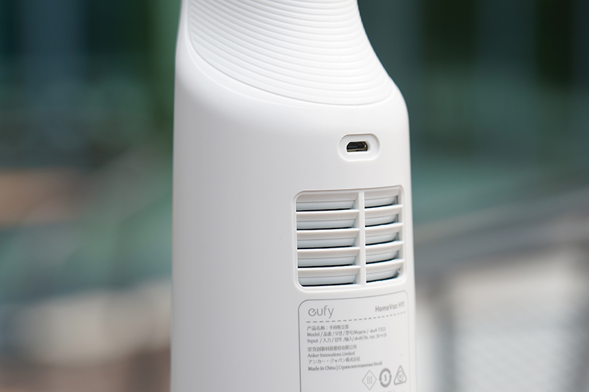 아래를 살펴보면 충전을 위한 마이크로 5핀 USB 포트가 배치되어 있습니다. 최근에 많이 사용되는 USB-C가 아니라는 점은 아쉽지만 아직 많이 사용되는 규격이라서 어렵지 않게 충전을 할 수 있습니다. 그리고 아래쪽에는 바람이 나오는 구멍이 배치되어 있는데요. 청소할 때 막지 않도록 주의해 주어야 합니다.