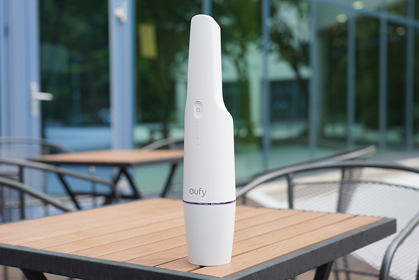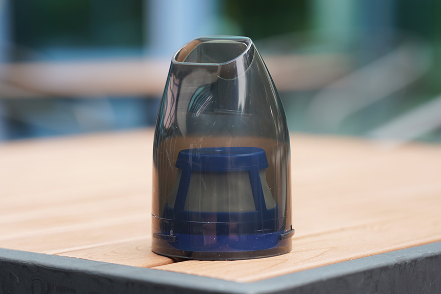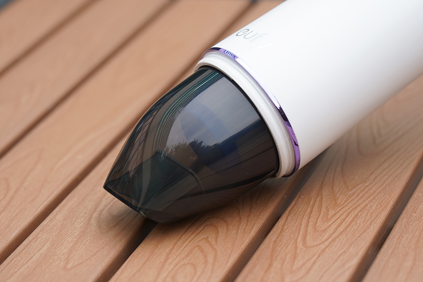 앤커 Eufy 홈백 H11 무선 핸디 청소기의 앞쪽에는 투명한 형태의 먼지함이 배치되어 있습니다. 검은색으로 제작되었기 때문에 먼지가 얼마나 있는지 확인할 수 있지만, 너무 적나라하지는 않다는 특징이 있습니다.
