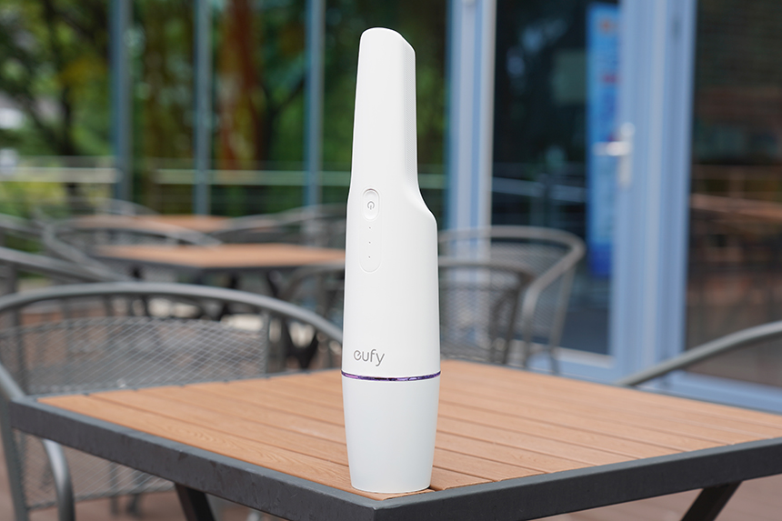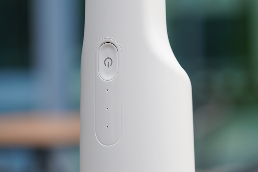 앤커 Eufy 홈백 H11 무선 핸디 청소기의 앞쪽을 살펴보면 흡입 On/Off 스위치가 배치되어 있습니다. 그리고 간단한 기능을 제공하는 제품이기 때문에 파워의 세기를 조절할 수 있는 기능은 없습니다. 그리고 아래쪽에는 전원 상태를 확인할 수 있는 3개의 LED가 배치되어 있습니다.