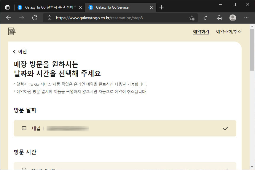 그리고 날짜를 선택해주면 됩니다. 삼성 갤럭시 투고(TO GO) 서비스 초기에는 사람들이 몰려서 자신이 원하는 순간에 예약하기 어려울 수 있습니다. 그렇지만 시간 여유가 있으니 조금 기다려보시면 될 것 같습니다.