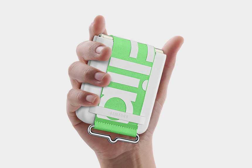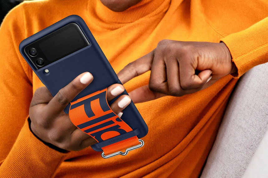 갤럭시 Z 플립3 5G 실리콘 커버 with 스트랩은 같은 실리콘 커버로 제작되었지만 링이 아니라 스트랩이 장착된 제품입니다. 이 제품은 손가락을 다 넣을 수 있어서 조금 더 안정적으로 사용할 수 있을 것으로 보입니다.