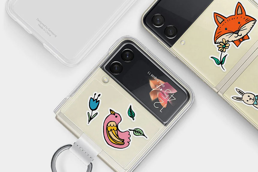 클리어 커버 with 링의 또 다른 특징은 각종 스티커를 이용해서 자신의 개성에 맞게 갤럭시 Z 플립3를 꾸며줄 수 있다는 점입니다. 참고로 가격은 33,000원으로 시리즈 중에서 가장 저렴합니다.