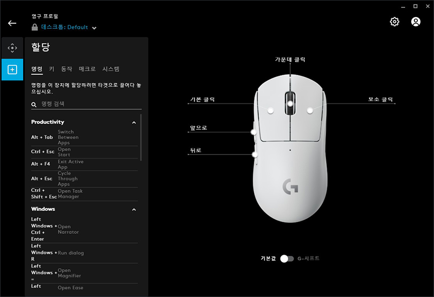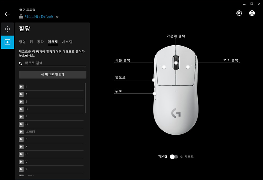 할당에서는 로지텍 G PRO X SUPERLIGHT 게이밍 마우스의 버튼에 자신이 원하는 기능을 할당할 수 있습니다. 만약 휠 클릭을 자주 사용하지 않는다면 가운데 클릭 버튼을 활용해주는 것을 추천합니다.