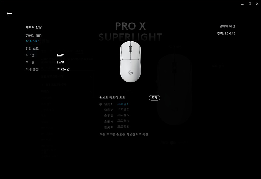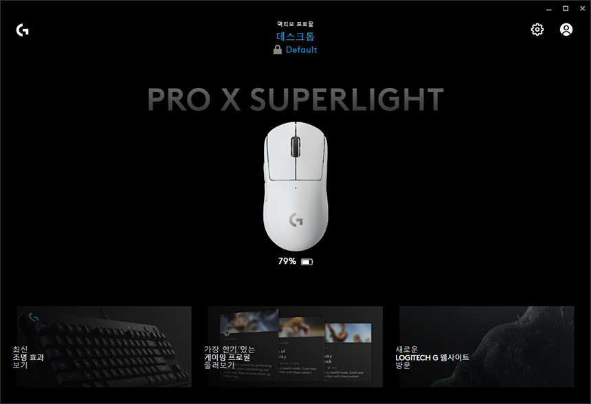 로지텍 G PRO X SUPERLIGHT 게이밍 마우스를 제대로 활용하기 위해서는 로지텍 G HUB라는 전용 소프트웨어가 필요합니다. 로지텍 홈페이지에서 다운로드받은 후에 설치하면 홈 화면에서 배터리 상태를 확인할 수 있습니다.