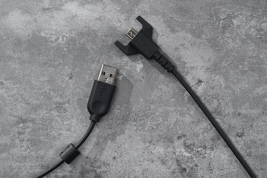충전/데이터 케이블은 로지텍 G PRO X SUPERLIGHT 게이밍 마우스를 충전시켜주거나 유선으로 사용할 때 활용할 수 있습니다. 커넥터 규격은 USB 마이크로 5핀이고 안정적으로 장착할 수 있도록 날개 형태의 구조물이 추가된 형태로 제작되었습니다.