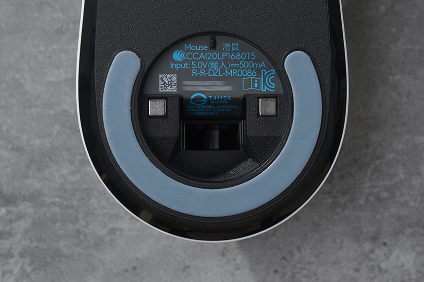 바닥을 살펴보면 새로 추가된 대형 무첨가제(ZERO-ADDITIVE) PTFE 피트가 부착된 것을 확인할 수 있습니다. 크기가 상당히 큰 편이어서 마우스 패드 위에서 부드럽게 움직일 수 있다는 장점이 있습니다.