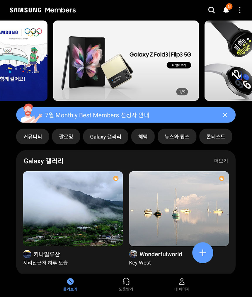 가장 먼저 자신이 사용하고 있는 삼성 폴드3와 플립3의 삼성 멤버스(SAMSUNG Members) 앱을 열면 중간 정도에 “혜택”이라는 아이콘이 준비된 것을 확인할 수 있습니다.
