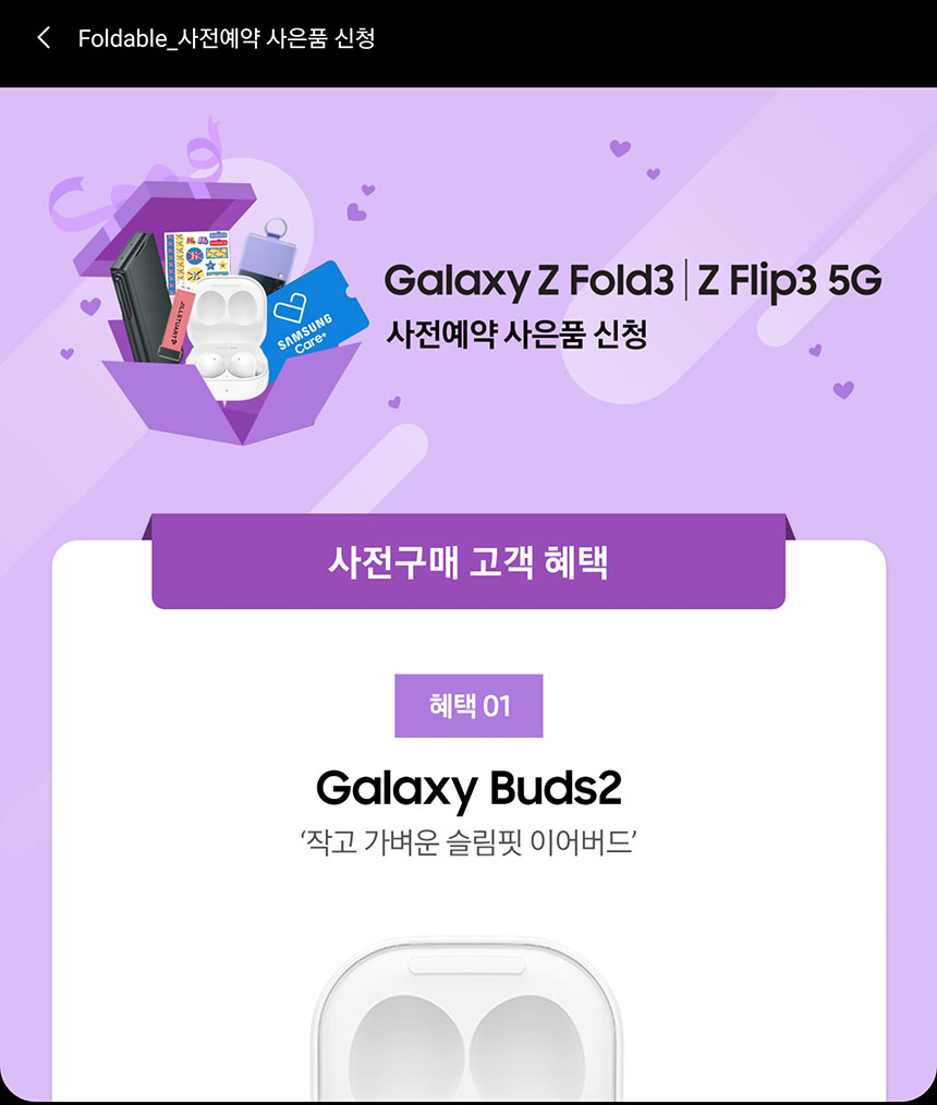 삼성 폴드3와 플립3 사전예약 혜택은 우선 갤럭시 버즈2 화이트가 기본 제공되고 플립커버 with S펜이나 클리어커버 with 링, 실리콘버커 with 링, 실리콘커버 with 스트랩이 추가 제공됩니다.
