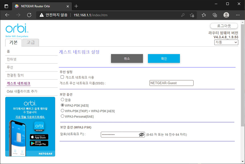 무선 메뉴에서는 네트워크 이름과 암호를 변경할 수 있습니다. 참고로 넷기어 오르비 RBK352 공유기는 2.4GHz와 5GHz 주파수 대역을 하나의 이름(SSID)로 사용하기에 때문에 사용자가 별도로 주파수를 신경 쓸 필요가 없어서 편리합니다.