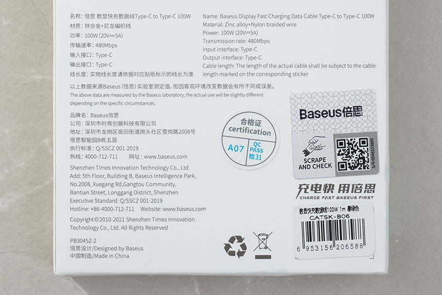 박스의 뒤쪽을 살펴보면 Baseus Display Fast Charging Date Cable Type-C to C 100w Cable이라는 문구가 표시되어 있습니다. 그리고 아연 합금 관절과 나일론으로 제작되었다는 점이 독특한 부분입니다.