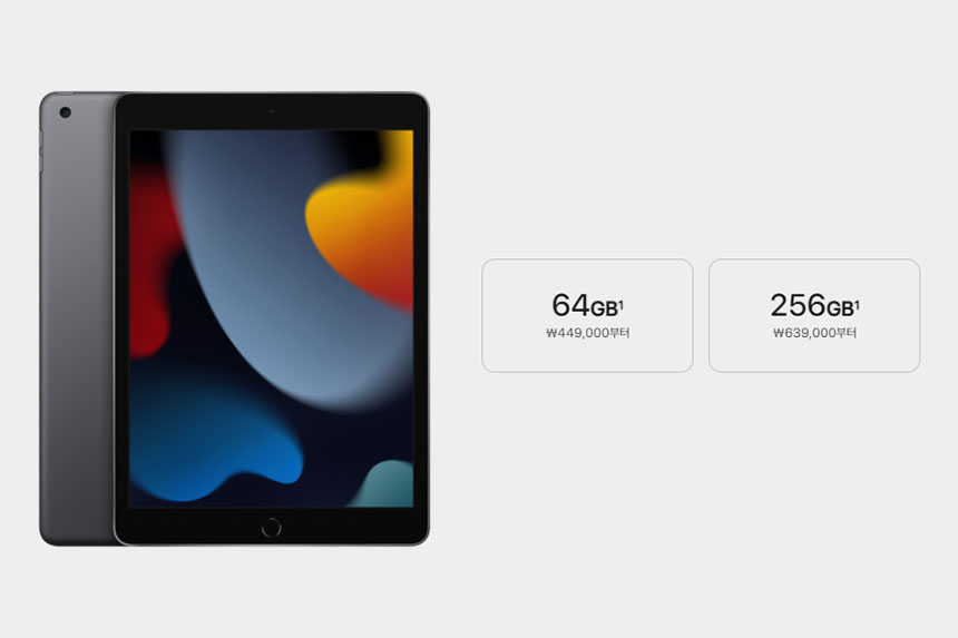 아이패드 9세대의 가장 중요한 가격은 64GB/44.9만원, 256GB/63.9만원으로 책정되었습니다. 사실 가장 저렴한 아이패드이지만 출시가로는 가성비가 좋다고 이야기하기는 어려울 것 같습니다.