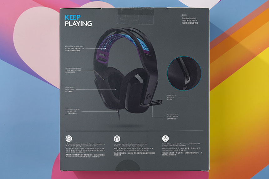 박스의 뒷면을 살펴보면 로지텍 G335 게이밍 헤드셋의 구조가 설명되어 있습니다. 주목할 만한 부분은 플립 음소거 마이크와 볼륨 휠 그리고 40mm 오디오 드라이버를 탑재했다는 점입니다.