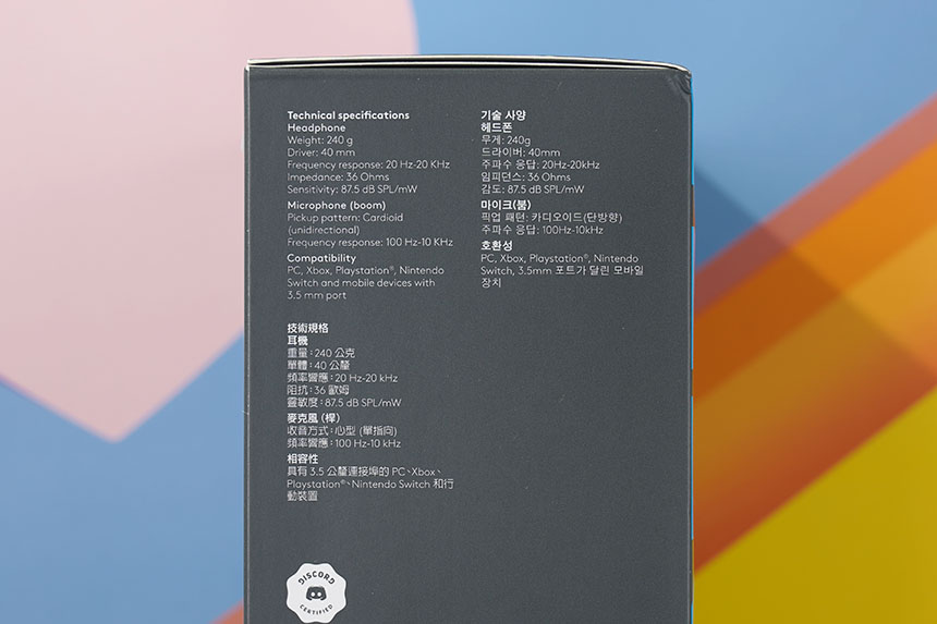 반대쪽 옆면에는 로지텍 G335 게이밍 헤드셋의 기술 사양(스펙)이 설명되어 있습니다. 특히 3,5mm 이어폰 단자를 채택한 유선 제품으로 제작되어서 PC와 XBOX 그리고 플레이스테이션과 닌텐도 스위치와 같은 제품에서도 사용할 수 있습니다.
