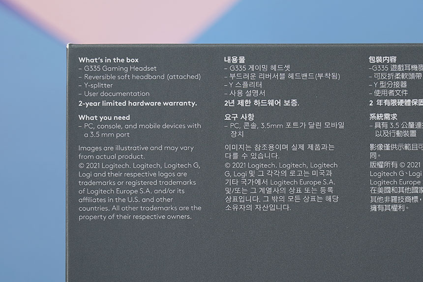 박스의 아래쪽에는 로지텍 G335 게이밍 헤드셋의 구성품이 설명되어 있습니다. 그리고 2년 동안의 제한 하드웨어 보증을 제공합니다. 사실 유선 게이밍 헤드셋들은 초기 불량이 아니라면 고장이 날 만한 부분이 거의 없습니다.