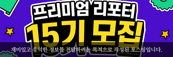 프리미엄 리포터 15기는 9월 1일부터 27일까지 모집을 진행하고 있고 인원은 10명입니다. 그리고 활동 기간은 약 1년 정도입니다. 그리고 정확한 리뷰를 작성해야 해서 어느 정도의 사진이나 동영상 편집 스킬이 필요합니다.