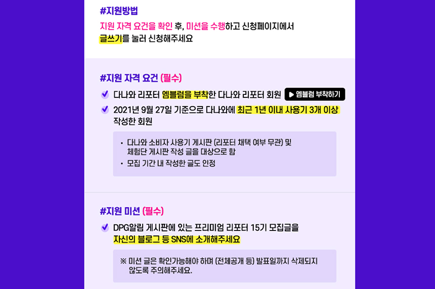 프리미엄 리포터 15기에 지원하기 위해서는 엠블럼을 다운로드한 후에 블로그에 삽입을 해야 하고 모집 관련 글을 자신의 블로그나 SNS에 업로드해야 합니다. 조건이 까다로운 편은 아니라고 할 수 있습니다.