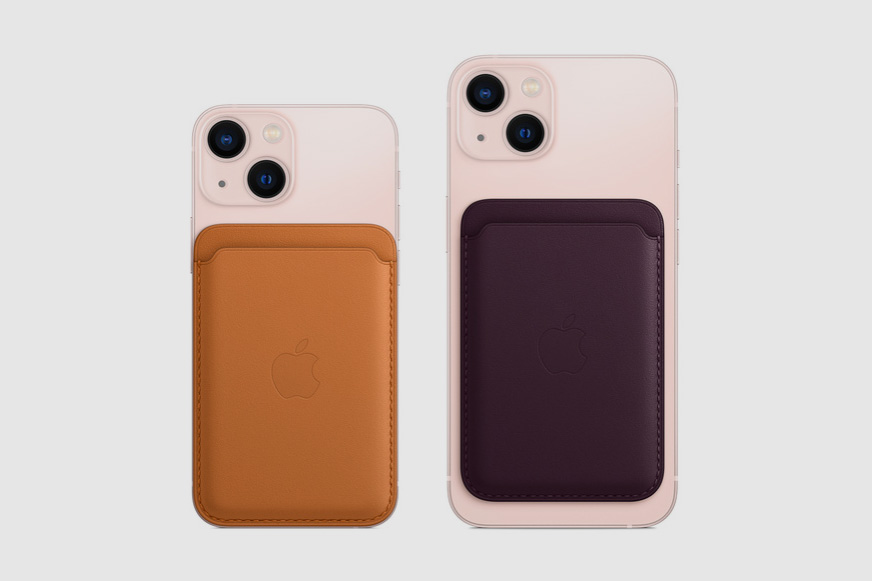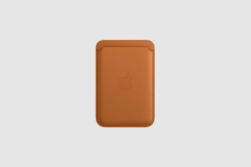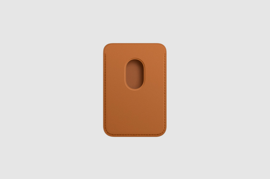 다음에 살펴볼 액세서리는 MagSafe 가죽 카드지갑입니다. 별도의 거창한 지갑을 휴대하기 부담스러운 분들에게 적합한 제품이고 신용카드나 신분증을 3장까지 넣을 수 있다고 합니다. 그리고 색상은 골든 브라운, 다크 체리, 세쿼이아 그린, 미드나이트, 위스테이라로 구성되어 있습니다.