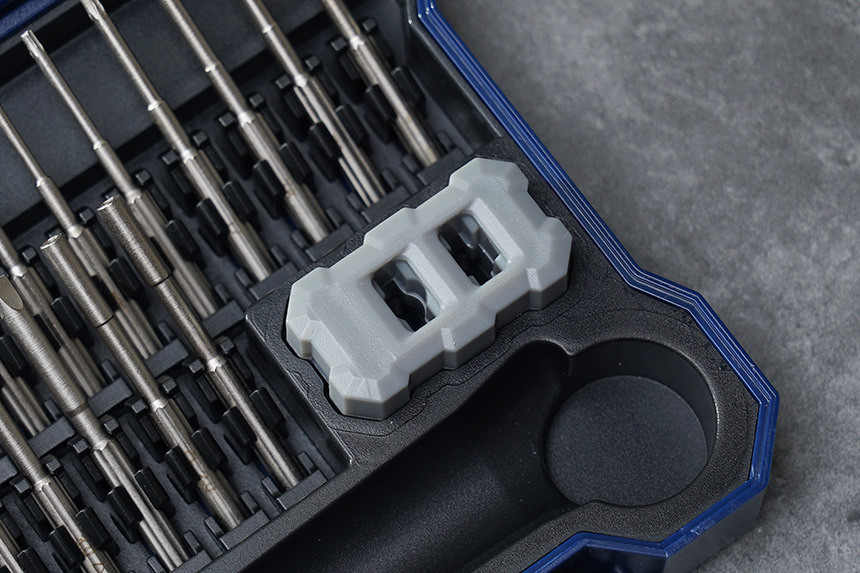 케이스의 내부에는 작은 플라스틱 조각이 포함되어 있는데요. 드라이버 비트를 내부에서 가져다 놓으면 자력이 생기는 부품입니다. 조금 더 편리하게 각종 작업을 할 수 있도록 도와주는 역할을 합니다.