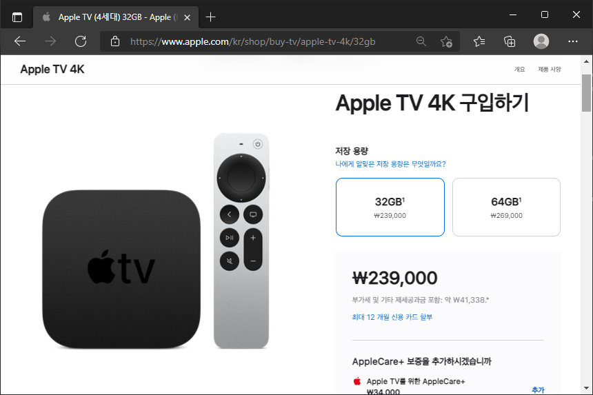 애플 TV 4K 2세대의 가격을 살펴보면 32GB 모델은 239,000원이고 64GB 모델은 239,000원입니다. 그리고 Apple TV+를 시청할 수 있는 Apple One은 매달 6,500원입니다. 아쉽게도 Apple One Premier이 서비스되지 않아서 Apple Fitness+를 사용할 수는 업습니다.