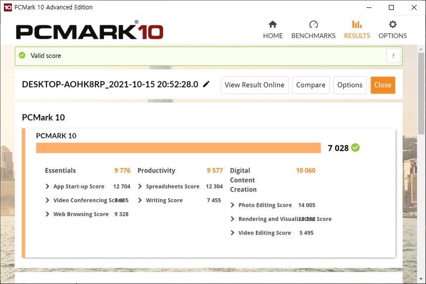 마지막으로 노트북의 전반적인 성능을 평가해주는 PCMARK10은 7,028점으로 측정되었습니다. 11세대 인텔® 코어™ i7-11800H 프로세서의 탑재로 인해서 뛰어난 성능을 보여주었습니다.