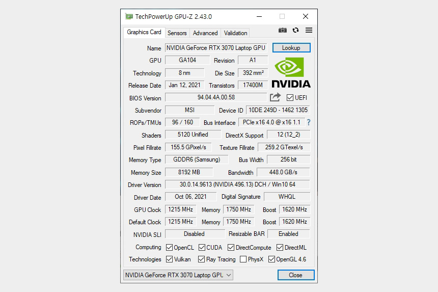 MSI GP76 레오파드 11UG에는 엔비디아 GeForce RTX 3070 그래픽카드가 탑재되었습니다. 강력한 성능을 제공하기 때문에 대부분의 게임을 플레이할 수 있습니다.