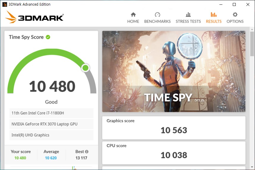 3DMARK 벤치마크 프로그램을 통해서 성능을 확인해 보면 FireStrike는 23,449점(그래픽 스코어 28,003점), Time Spy는 10,480점(그래픽 스코어 10,563점)으로 측정되었습니다.