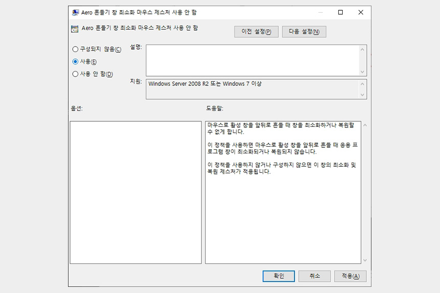 3. Aero 흔들기 창 최소화 마우스 제스처 사용 안 함 설정
