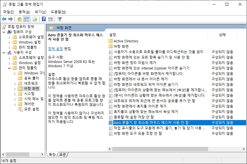 다음에는 왼쪽의 메뉴를 사용자 구성 – 관리 템플릿 – 바탕 화면으로 이동합니다. 그러면 다양한 설정들이 준비된 것을 확인할 수 있습니다. 자세하게 읽어 보시고 필요한 부분을 변경해 주면 됩니다.