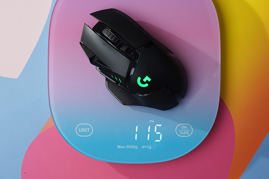 무게는 115g으로 측정되었습니다. 1.2mm의 얇은 두께와 초경량 스포크 휠 등의 기술이 적용되어서 무선 게이밍 마우스 중에서는 가벼운 축에 속합니다. 만약 가볍다고 생각되면 무게추를 이용해서 최대 16g을 추가할 수 있습니다.