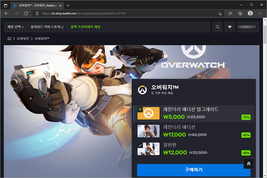 오버워치는 일반판은 46% 할인을 해서 12,000원이고 레전더리 에디션은 62% 할인을 해서 17,000원입니다. 그런데 오버워치의 경우에는 게임은 정말 잘 만들었지만 운영이 조금 아니 많이 아쉽습니다.