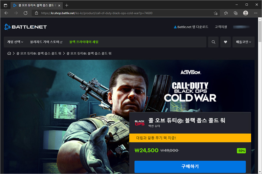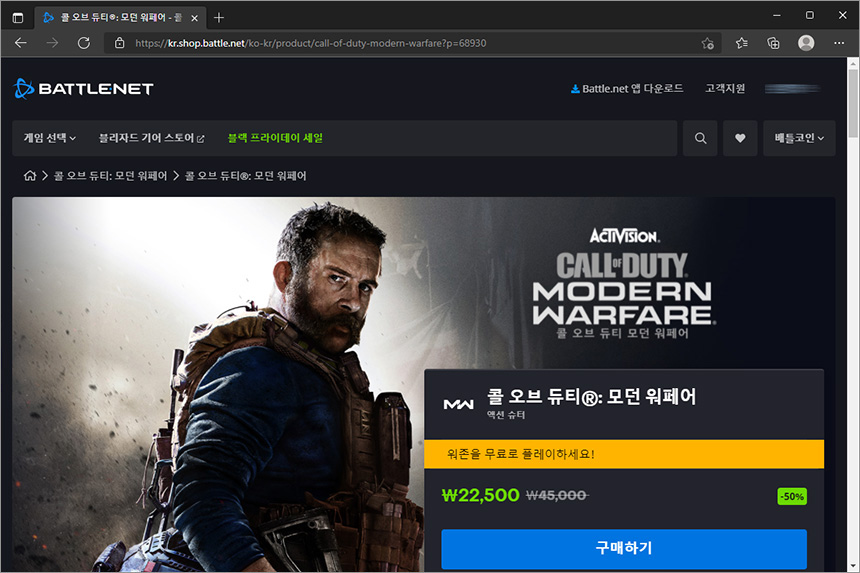 다음은 콜 오브 듀티®: 블랙 옵스 콜드 워와 콜 오브 듀티®: 모던 워페어도 각각 50% 할인을 해서 24,500원과 22,500원에 판매를 하고 있습니다. 콜 오브 듀티®: 뱅가드는 11월 23일까지 기간 한정으로 무료 플레이가 가능하다고 합니다.
