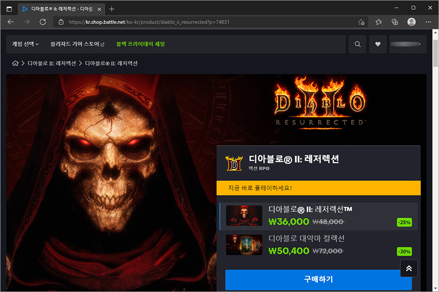 가장 먼저 살펴볼 게임은 아재들의 추억을 되살릴 수 있는 디아블로® II: 레저렉션입니다. 일반 버전의 경우에는 25% 할인을 해서 36,000원이고 디아블로 대악마 컬렉션의 경우에는 30% 할인을 해서 50,400원입니다.