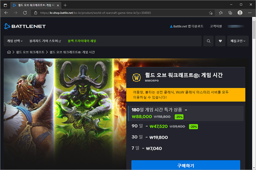 월드 오브 워크래프트®: 게임 시간의 경우에는 180일 기준으로 25% 할인을 해서 88,000원입니다. 그리고 어둠땅 – 꾸러미나 별바라기 꾸러미도 세일을 진행하고 있습니다.