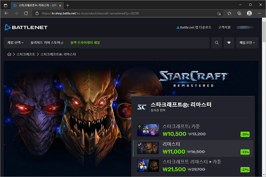 아재들의 국민 게임이라고 할 수 있는 스타크래프트® 리마스터의 경우에는 33% 할인을 해서 11,000원이고 카툰의 경우에는 20% 할인해서 10,500원입니다. 아재라면 하나 가지고 있을 만 합니다.