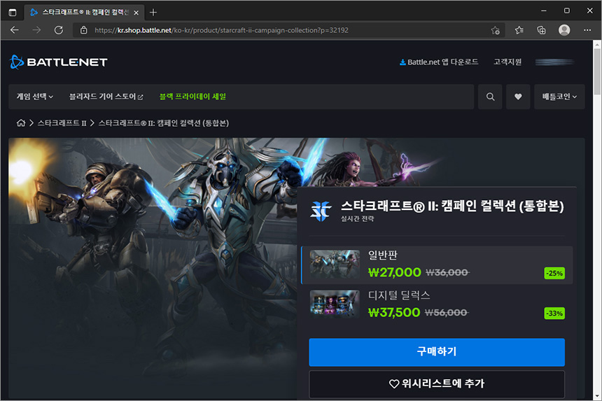 스타크래프트® II: 캠페인 컬렉션 (통합본)의 경우에는 25% 할인을 해서 27,000원입니다. 사실 캠페인만 해도 값어지는 충분히 하는 게임이라고 할 수 있습니다.