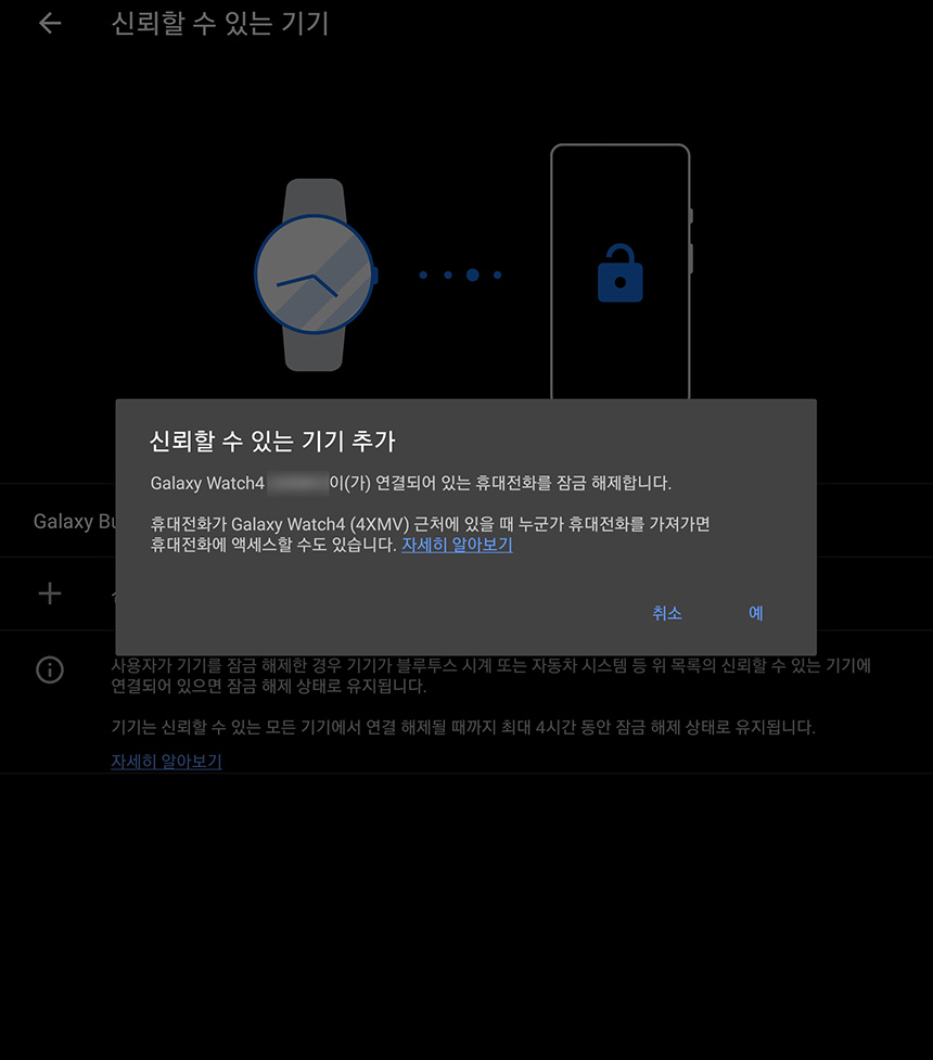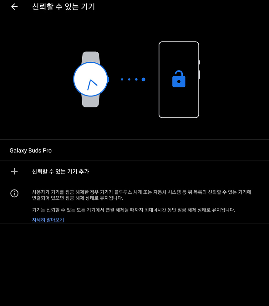 마지막은 제가 사용하려고 하는 신뢰할 수 있는 기기입니다. 특히 갤럭시 워치4와 같은 스마트워치를 설정해 놓으면 사무실이나 방에 핸드폰을 놓아두고 잠시 다른 곳에 다녀올 때 편리하게 사용할 수 있습니다.