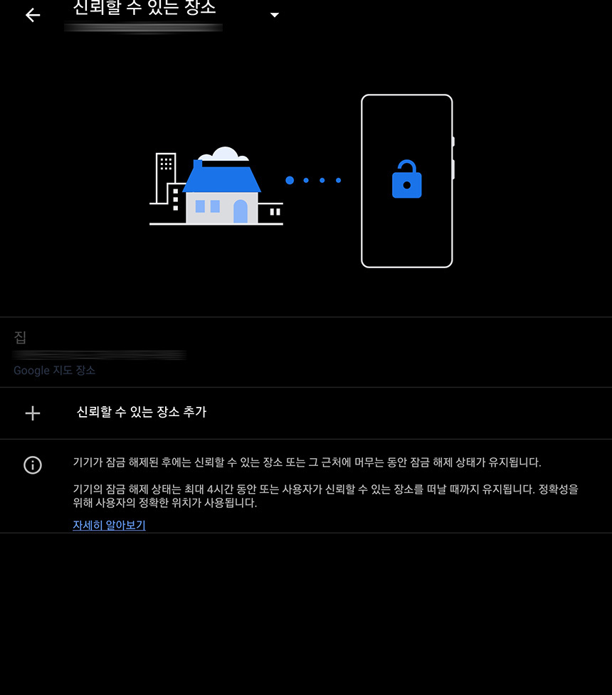 신뢰할 수 있는 장소는 집이나 사무실 등 자신이 자주 가는 안전한 장소를 설정해 놓으면 해당 위치에서 간편하게 잠금을 해제할 수 있습니다. 믿을 수 있는 장소에서만 활용하는 것이 좋을 것 같습니다.