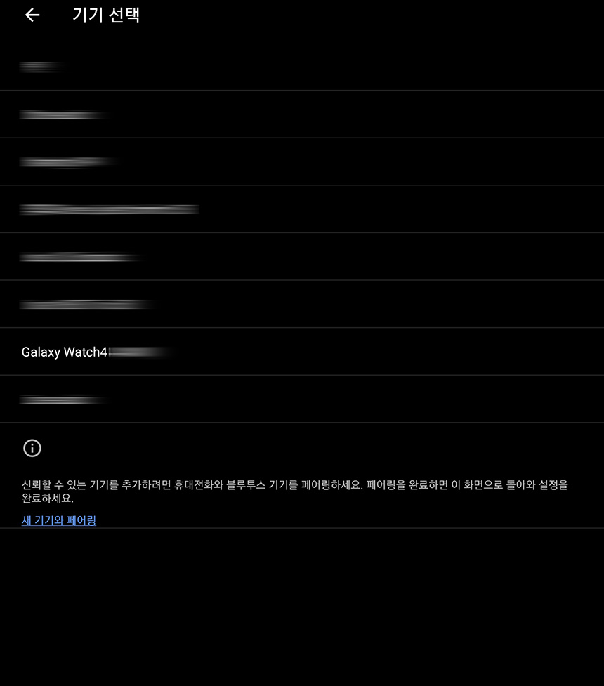 신뢰할 수 있는 기기를 선택하면 자신의 스마트폰에 연결된 블루투스 기기들의 리스트가 표시됩니다. 그래서 갤럭시 워치4는 물론이고 다른 회사의 제품들도 연동해서 사용할 수 있습니다.
