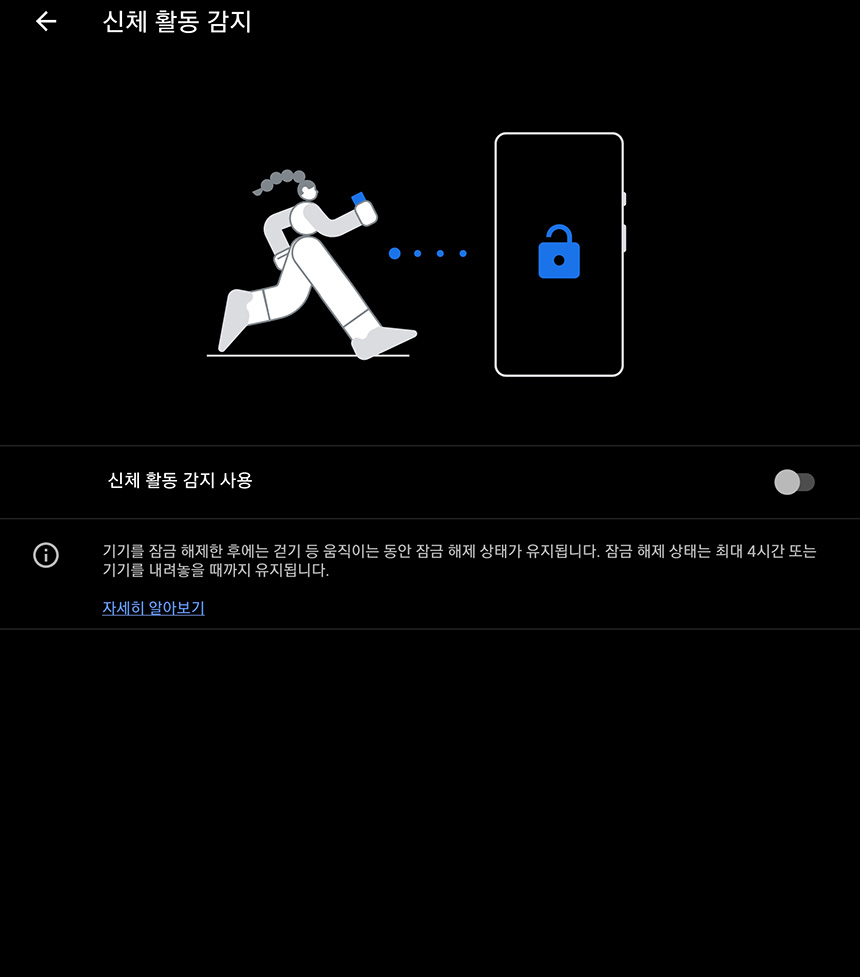 신체 활동 감지 사용을 선택하면 한 번 스마트폰의 잠금을 해제한 후에 걷기 등 움직이면 최대 4시간까지 잠금 해제 상태가 유지됩니다. 운동할 때 활용하면 좋을 기능입니다.