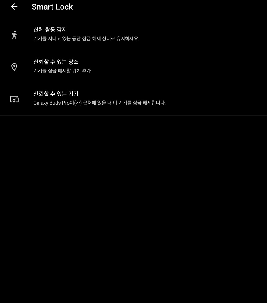 Smart Lock 기능을 살펴보면 신체 활동 감지와 신뢰할 수 있는 장소 그리고 신뢰할 수 있는 기기 중에서 자신이 원하는 기능을 선택할 수 있습니다. 필요에 따라서 활용해주는 것이 좋을 것 같습니다.