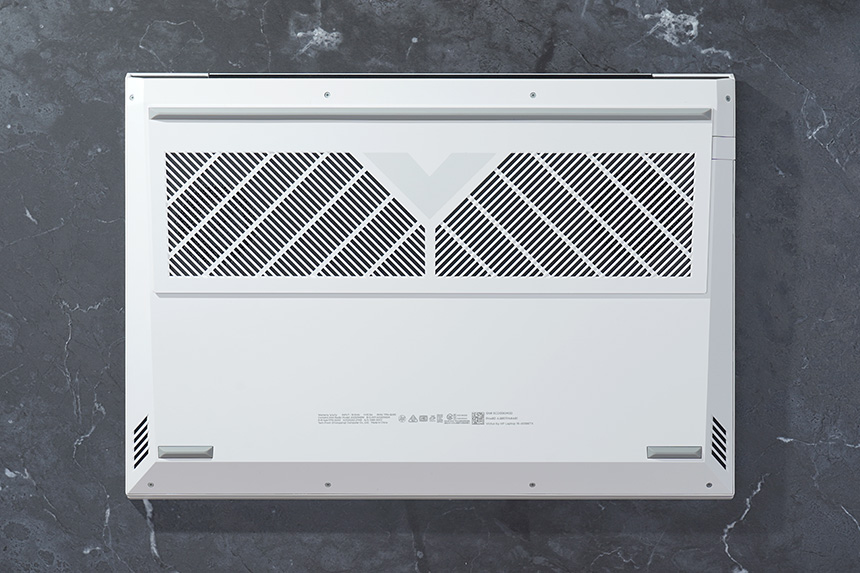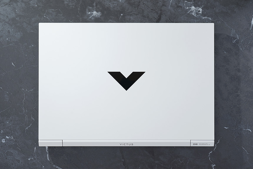 HP 빅터스 16-d0186TX의 상판은 깔끔한 느낌을 주는 세라믹 화이트 색상으로 제작되었습니다. 게이밍 노트북에서는 찾아보기 힘든 컬러라고 할 수 있습니다. 그리고 중앙에 심플한 디자인에 포인트가 되는 V 로고가 배치되어 있습니다.
