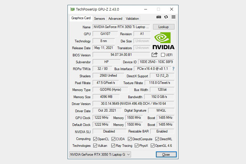 HP 빅터스 16-d0186TX에는 엔비디아 GeForce RTX3050 Ti 그래픽카드가 탑재되었습니다. 엔트리급 제품이기는 하지만 게임 대부분을 문제없이 플레이할 수 있습니다.