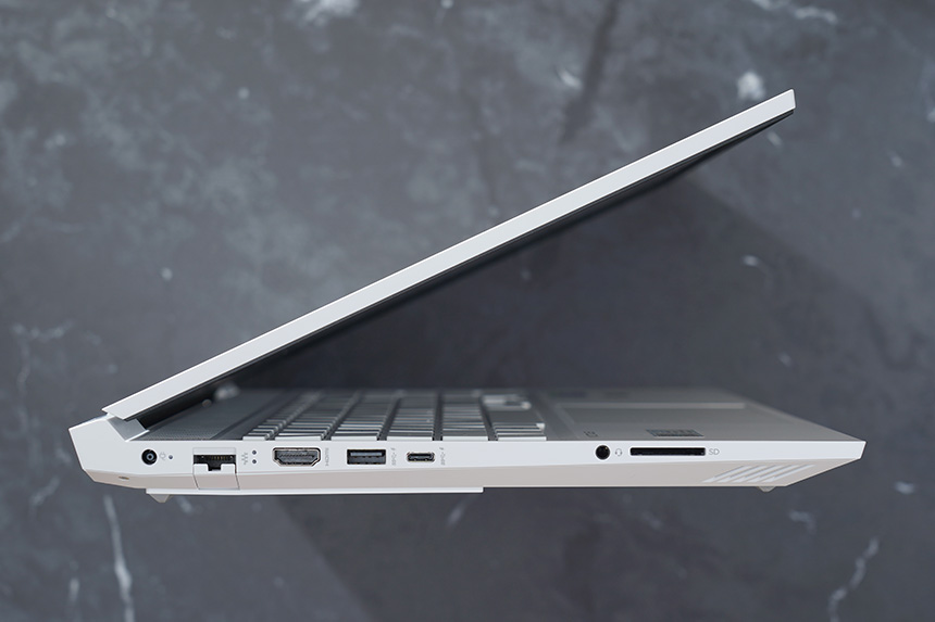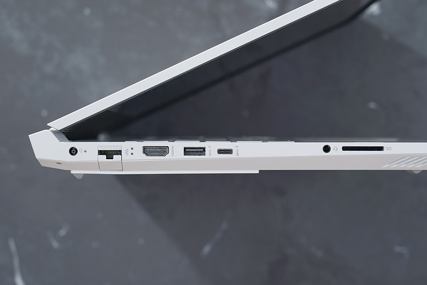 HP 빅터스 16-d0186TX의 입출력 단자를 살펴보면 왼쪽에는 전원과 유선랜 그리고 HDMI와 USB 타입A와 C 포트가 배치되어 있습니다. 그 외에도 오디오 콤보와 SD카드 슬롯을 내장하고 있습니다.