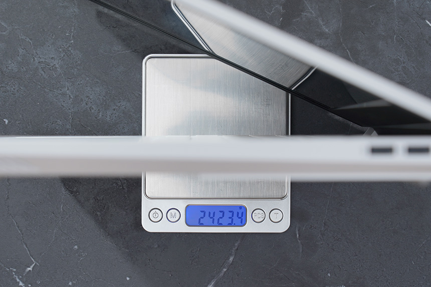 무게는 약 2.42kg으로 측정되었습니다. 슬림 노트북과 비교하면 무겁다고 생각할 수도 있지만 게이밍 노트북 중에서는 역시 가벼운 축에 속한다고 할 수 있습니다.